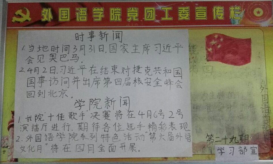 时事新闻:当地时间3月31日,国家主席习近平在华盛顿会议中心会见美国总统奥巴马,就中美关系发展及共同关心的国际和地区问题深入交换意见。在结束对捷克共和国国事访问并出席在美国华盛顿举行的第四届核安全峰会后,国家主席习近平2日回到北京。 学院新闻:我院“十佳歌手”决赛将在4月6号二号演播厅举行,期待选手们的精彩表现。tyc41183太阳成集团系列特色活动“第六届外语文化月”将在四月全面展开。