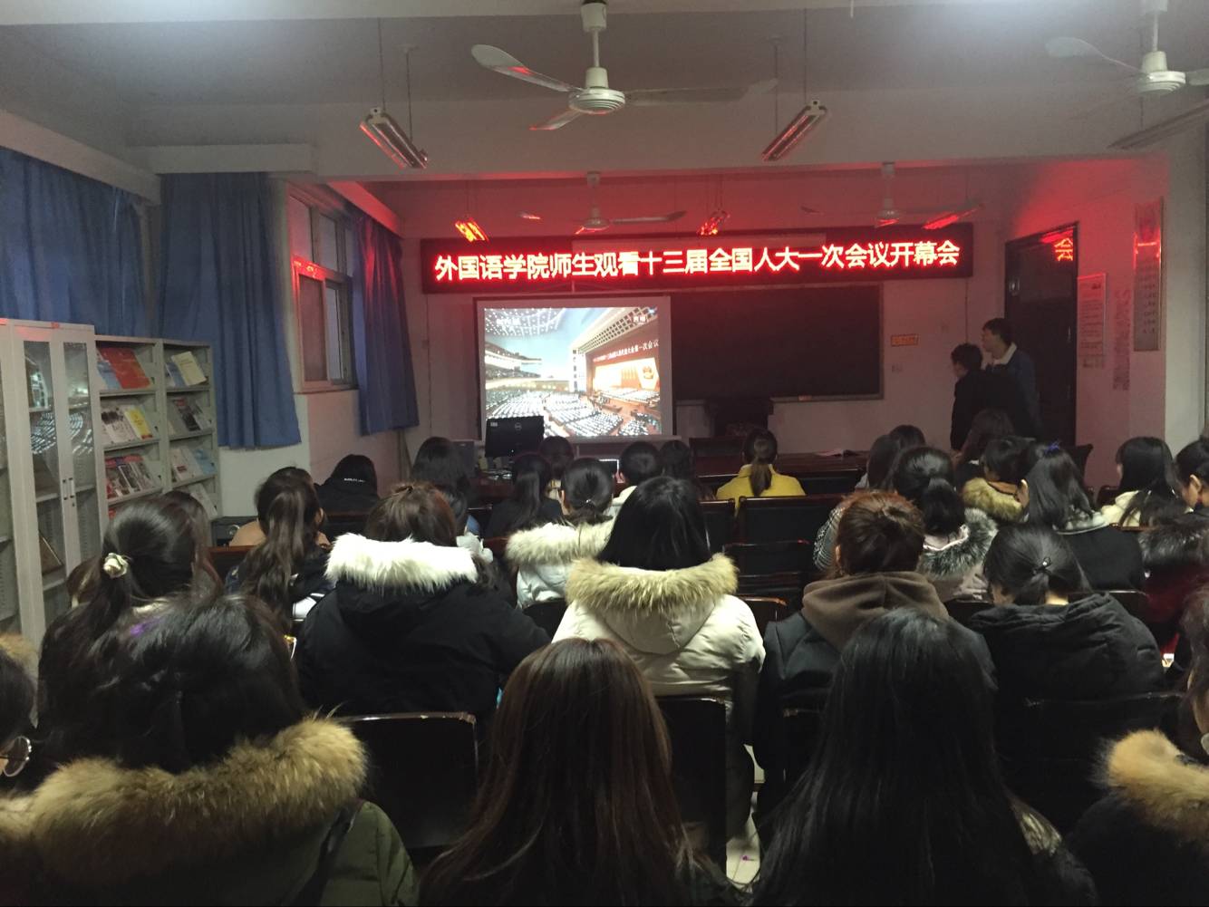 第十三届全国人大一次会议于昨日上午9时在北京开幕。为加强我院学生党支部建设,促使学生展现出青年人的担当精神,紧跟时代步伐,弘扬时代精神,争做时代先锋。学院党总支安排了学生积极分子观看人大一次会议开幕会,引导学生关注两会内容,学习两会精神。我院全体在校学生党员、预备党员、发展对象及部分积极分子共同在11号楼214室观看开幕会,聆听了李克强总理所作的政府工作报告。会后,同学们展开深入的交流讨论,并积极发表观后感。作为党和国家的一件大事,两会的召开是所有基层党支部难得的一次学习机会,在接下来的时间,我院将继续组织党员,积极分子关心关注两会,认真学习,积极实践,为国家、社会贡献自身力量。