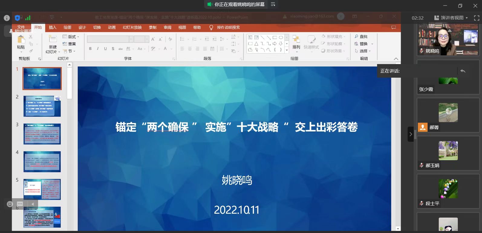 姚晓鸣以“锚定‘两个确保 ’, 实施‘十大战略’,交上出彩答卷”为题,从国际、国内和河南省经济社会发展实际分析了“十大战略”的产生背景与重大意义,详细解读了具体内容,特别是创新驱动、科教兴省、人才强省战略的高等教育支撑及其给我校发展所带来的机遇,分析深刻,事例详实。她指出,实施“十大战略”是省委立足加快建设现代化河南,持续落实习近平总书记视察河南重要讲话重要指示的具体行动,是实现“两个确保”奋斗目标的战略路径。她强调,作为高校党员师生要胸怀“两个大局”,要结合自身实际,主动服务、主动融入,立足构建新发展格局,勇毅前行,为河南振兴、学校和学院高质量发展做出应有的贡献。(通讯员 李向民)