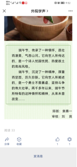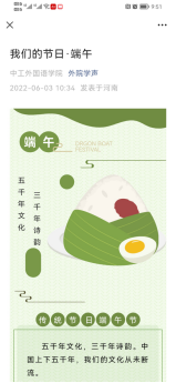 学院通过“外院学声”微信公号推送“我们的节日·端午”主题图文,宣传介绍端午节佩香囊、挂艾虎、赛龙舟等传统文化风俗,弘扬端午节所蕴含的深厚的爱国主义情怀和伟大的爱国主义精神。