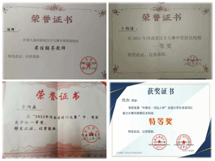 获奖情况:汉语国际教育专业学生年均获国家级、省级、校级奖20余项。期间,学生在中国国际大学生创新大赛、全国大学生创新创业大赛、河南省汉字大赛、河南省诗词大赛、全国高校传统文化知识竞赛“中学西渐”杯汉语国际教育综合技能大赛、河南省高校新媒体作品通讯类等竞赛中均取得了优异的成绩。